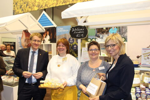 Auch in diesem Jahr war die Käsestraße Schleswig-Holstein am Gemeinschaftsstand vertreten. Cindy Jahnke und Kirsten Möllgaard, beide im Vorstand des Vereins, konnten mit Ministerpräsident Daniel Günther und Kammerpräsidentin Ute Volquardsen über das 20-jährige Jubiläum der Käsestraße Schleswig-Holstein in diesem Jahr sprechen. Zu diesem besonderen Anlass gab es eine Jubiläums-Käsetüte zu kaufen, die sich großer Beliebtheit erfreute.