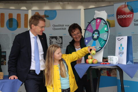Neben dem vielseitigen Programm auf den Bühnen kamen zahlreiche Aussteller zusammen um die Besucher über die Vielfalt des Bundeslandes zu informieren. Der Fachbereich Gütezeichen der Landwirtschaftskammer Schleswig-Holstein war mit drei unterschiedlichen Themenbereichen vertreten. Passend zur Geschichte des Landes blickte das Gütezeichen „Geprüfte Qualität Schleswig-Holstein“ in einer kleinen historischen Ausstellung auf die vergangenen 55 Jahre Gütezeichen-Geschichte zurück. Am GUTES VOM HOF.SH Stand wurden zahlreiche Produkte von Schleswig-Holsteins Direktvermarktern präsentiert. Zu gewinnen gab es verschiedene Genusspakete mit Produkten der Direktvermarkter aus dem Marktplatz. Am WIR FISCHEN.SH stand informierte Fischer Jörn Ross über die Herausforderungen des Fischerberufes in der heutigen Zeit.
