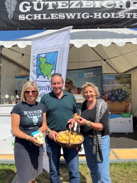 Auch in diesem Jahr erfreute sich der Gütezeichen-Stand bei den „Metalheads“ größter Beliebtheit. Die frischen Pellkartoffeln mit Holsteiner Katenschinken g.g.A. oder Glücksstädter Matjes g.g.A. sind inzwischen bei vielen Besuchern fester Bestandteil des Festival-Speiseplans. Auch die Käsevariationen aus der Meierei Sarzbüttel und der Hofkäserei Backensholz wurden gut nachgefragt. Bereits seit 10 Jahren engagiert sich das Gütezeichen auf dem weltgrößten Heavy-Metal-Festival im Kreis Steinburg. Zusätzlich zu den Wackener Landfrauen arbeiten inzwischen auch zahlreiche freiwillige Helferinnen und Helfer am Gelingen der Präsentation heimischer Produkte mit. Auch die Pellkartoffelhoheiten aus Hohenlockstedt waren für den guten Zweck im Einsatz. Bereits seit Beginn der Kooperation mit der Wacken-Foundation werden die Erlöse des Gütezeichen-Standes zur Förderung des künstlerischen Nachwuchses an die Foundation gespendet.